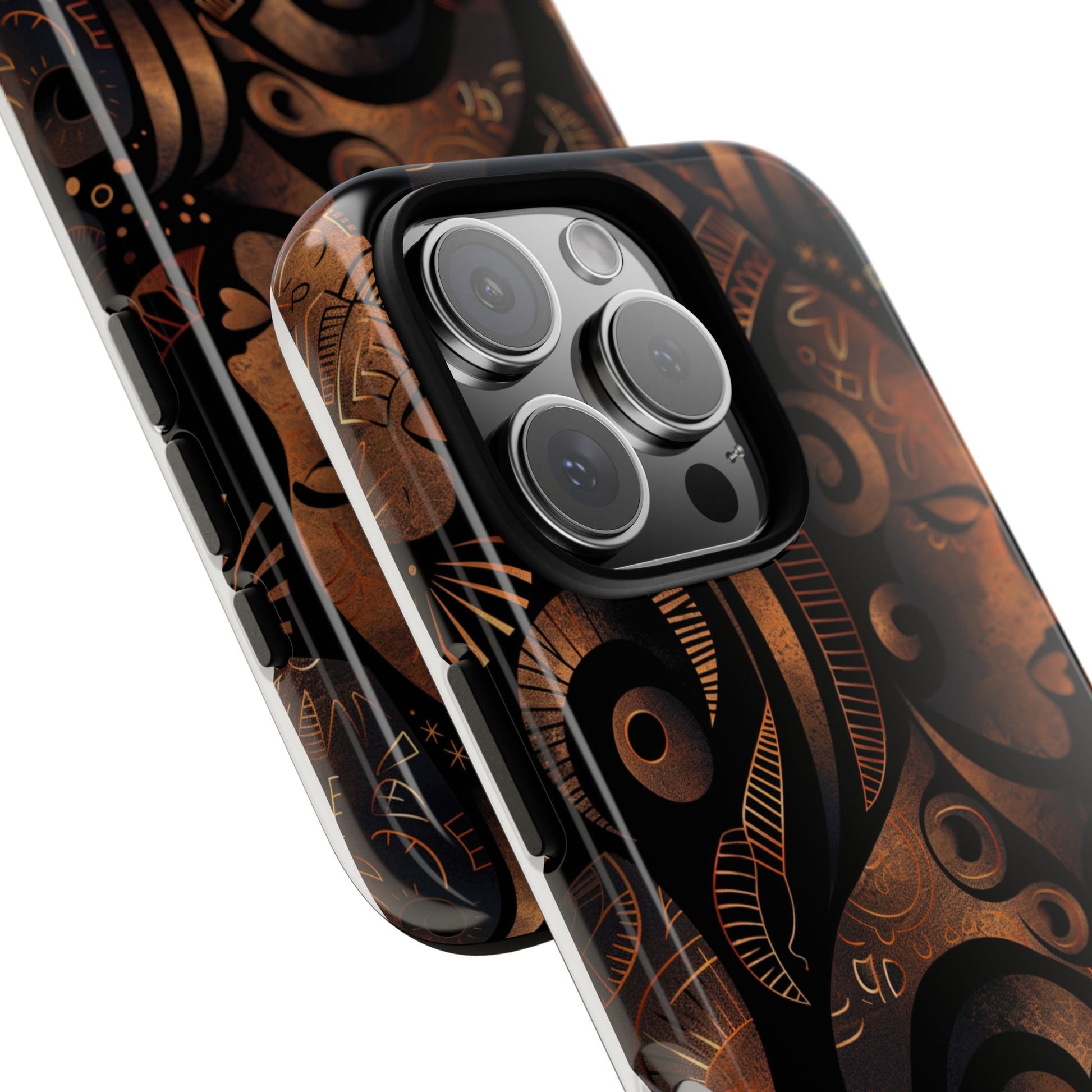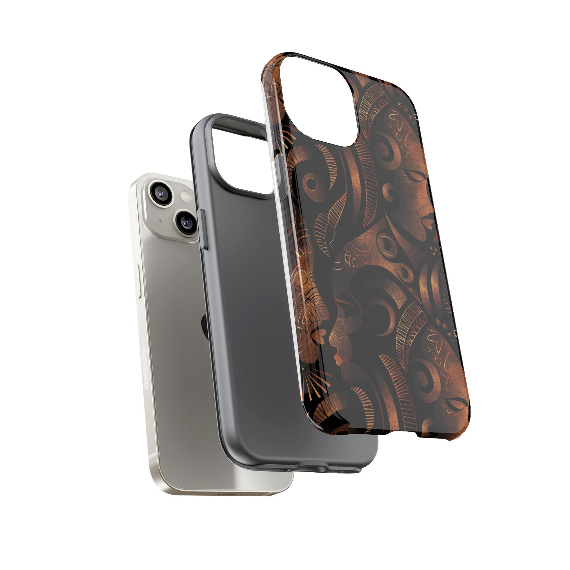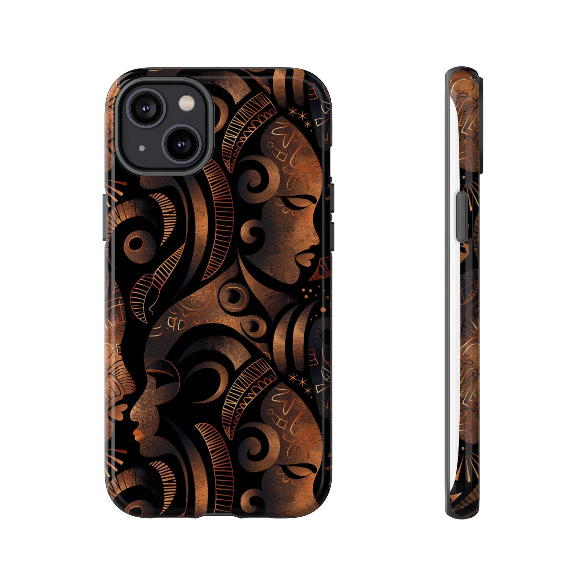 The Celestial Silhouettes Tough Case for iPhone honors the divine feminine and the cosmic rhythm of African heritage. Interwoven profiles reflect lineage, unity, and generational wisdom, while celestial symbols evoke spiritual grounding and ancestral protection. The deep bronze and black tones add a luxurious warmth, transforming your phone into a statement of identity and strength. Built with dual-layer durability, this case offers serious protection—without compromising on meaning or elegance.